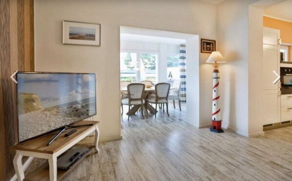 Sowohl im Wohnzimmer als auch in allen Schlafzimmern gibt es TV-Geräte, außerdem im Wohnzimmer eine Sonos-Anlage für Musik und einen DVD-Player.