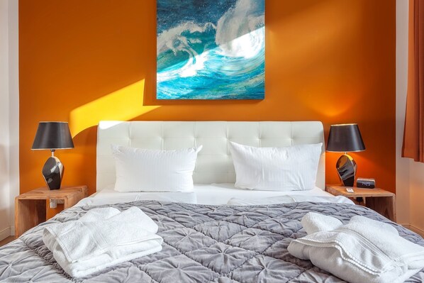 Das liebevoll eingerichtete Appartement beinhaltet ein großzügiges Schlafzimmer mit einem Doppelbett (2 x 90 x 200) einen geräumigen 4-teiligem Kleiderschrank und einer Kommode. Natürlich ist auch im Schlafzimmer ein Flachbild-TV integriert.