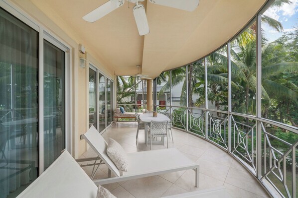 Relax on the screened porch with comfortable lounge seating, or enjoy the many outdoor dining and lounging spaces throughout the property. Guests also have access to BBQ grills and a pristine white-sand beach, complete with shade huts and umbrellas.