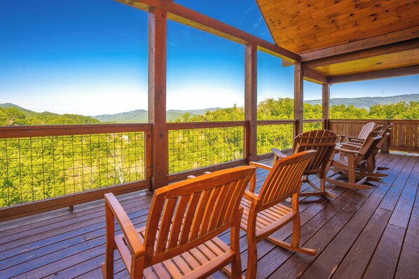 Step out onto the expansive, covered deck and enjoy a cook-out on the gas grill. Relax around the patio dining table or in one of the rockers while enjoying the beauty of Smokies.