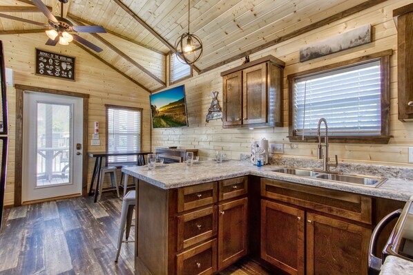 What an adventure!! Stayed Dec 24th-Dec 31th. We got a call saying everything was frozen at the cabins because of the weather. We could either stay at a later date or was advised to bring gallons of water with us to accommodate our needs while staying (another cabin was offered to us for showering). We decided to continue our trip since we were almost there anyway. We arrived with very easy check-in & the cabin was very warm & comfortable!! We didn't get water in the cabin until Wednesday, but we didn't mind at all. The guys worked so hard in the freezing weather to try & get everyone's water going that was brave enough to stay. As for the kitchen utensils, there were plenty dishes & pots, but no baking pans or mixing bowls, (we don't usually eat out much, but like to do our own cooking). It didn't slow me down but used what was there to make do. The bed was very hard & eventually went to Wal-Mart & got a mattress topper. The only thing we would change would be the king size bed in the downstairs bedroom. With us being older with some mobility issues there was no room on either side of the bed to get out easily. It was difficult getting in & out of the bed. We did get snow which was a Great bonus!! We will be staying with you again!!