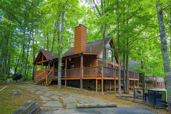 Step out onto the covered, wrap-around deck on the main level, enjoy a meal at the outdoor dining table, relax in one of the rockers while taking in the sounds of nature, or spend some quality time in the soothing hot tub.