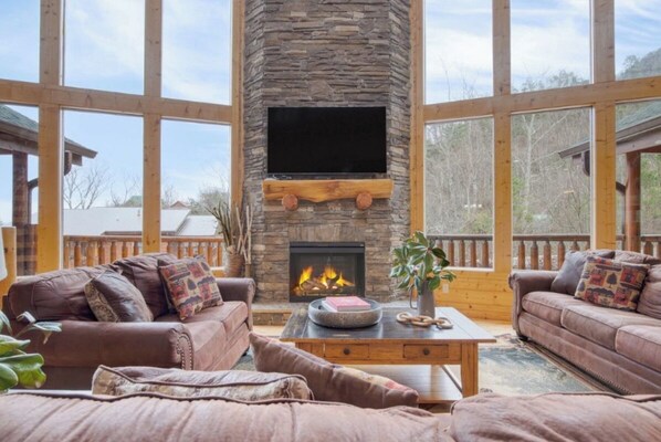 Gorgeous, fully furnished log cabin retreat with mountain décor and tons of amenities; Spacious living area with fireplace, comfy couches and flat screen TV with vaulted ceilings and huge windows; Open floor plan with living and dining on the same level; Fully equipped kitchen; Jacuzzi Tubs; Wifi; Fireplaces