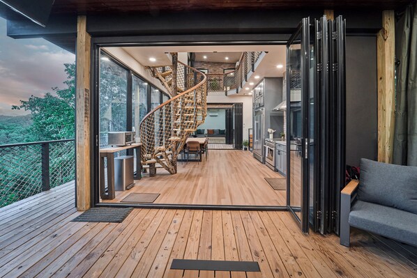 Experience true luxury while in Trees! At just fifteen minutes from Dollywood, experience the feeling of being in a treehouse but feeling like you're in a millionaire dollar luxury estate. With its 10 ft ceilings, open up the 4 large bi folding doors to combine the 2000 square feet of interior space with the 2000 square feet of deck to open up a perfect space for multiple families to enjoy. Each bedroom has a glass fogging bi folding door to enjoy privacy and the view with a flick of the switch.