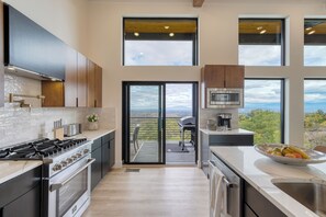 Inside, the great room steals the show with its towering ceilings, massive windows, and a crackling fireplace—the perfect place to gather. The fully equipped chef’s kitchen, complete with a gas range, coffee station, and barstool seating, invites you to craft delicious meals while soaking up the mountain views. Just off the dining area, a table for eight welcomes family-style dinners or festive gatherings.