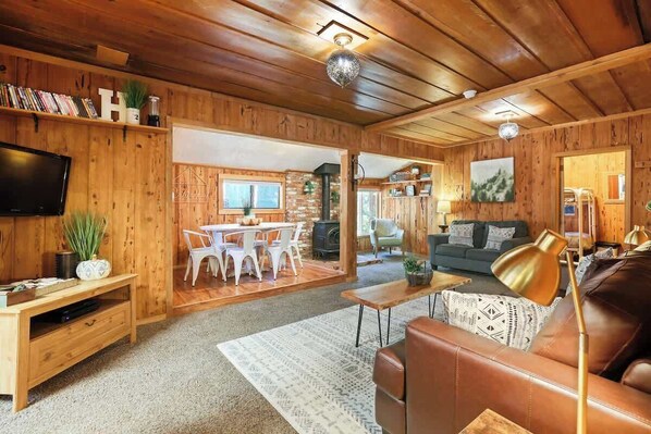 An original Shaver Lake cabin, The Hideaway is quaint in size, with one main living space, two small bedrooms, a fully equipped kitchen, dining space, and bathroom. You'll love hanging out in the mountain air outside on the upper and lower decks, around the fire pit, BBQing, and hanging out at the picnic table under the cafe lights. The fireplace inside is easily workable with an on/off switch and heats the whole cabin! The cabin is a quick 5-minute WALK to town, easy for any ability level- from kids to grandparents! Right behind the cabin, you'll find a small stream in the spring and summer, and a hill perfect for sledding and snow play through the winter months! 5-10 minute drive to the lake, 25-30 minute drive to China Peak Ski Resort.  Parking for 1-2 cars and a boat in the summer.