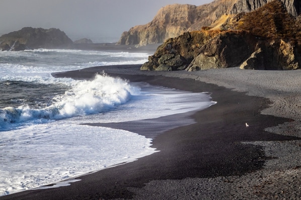 Mere minutes away from the awe-inspiring rocky coastline, black sand beaches, tide pools teeming with starfish, sea urchins, hermit crabs, & more.