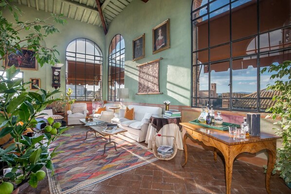 An den Wänden sind Porträts der Vorfahren des Inhabers und die Fenster, die einen atemberaubenden Ausblick bieten, auch natürliche Gemälde. Die Halle führt zu zwei möblierten Terrassen.