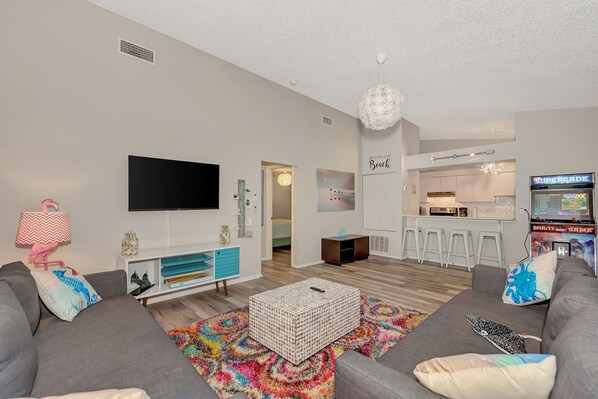 Comfortable and inviting, ideal for relaxing after a busy day or enjoying family fun.