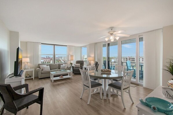 As you enter the condo, you are greeted by an open concept space which features cozy seating areas, ...TV and a dining room table. The openness of the floor plan allows for entertaining, family dinners and a sense of togetherness. The sliding gass doors open to create an indoor/outdoor living space where you can relax with picturesque views of palm trees swaying in the breeze (Siesta Key and the Gulf of Mexico). Prepare your favorite meals in the fully stocked kitchen connected to the living space. The large master suite boasts an ensuite bathroom with separate dressing area, walk-in closet and balcony access. The spacious guest bedroom also has a walk-in closet and balcony access. Complementary Wi-Fi is provided in the condo and through out The Anchorage complex.