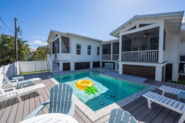 The outdoor spaces are equally impressive, designed with relaxation and entertainment in mind. The large screened-in patio provides ample space for gatherings, complete with bar seating, a dining area, and a comfortable lounge setup with a Smart TV. The pool area is perfect for enjoying the Florida sunshine, with both shaded and open seating for your comfort.