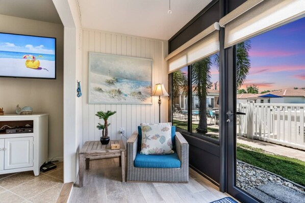 - Sunroom with direct access to the community heated pool