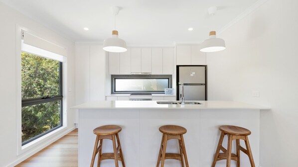 As you step through the entryway of this contemporary two-storey residence, you are greeted by a living area adorned with large windows that allow natural light to flood the space. There is a sofa-bed couch for the children to relax on while watching movies on the big screen TV and a split-system for year round comfort.
