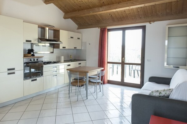 Description: first and last floor. Entrance to living room with dining table, new kitchenette (with dishwasher) and double sofa bed – large bedroom with double bed – bathroom with shower cubicle and washing machine – delightful terrace equipped with table and chairs – reserved parking space – air conditioning in each room - exclusive shared swimming pool.