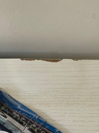 Das Badezimmer; das Waschbecken auf billigen Spanplatten, die aufgequollen sind.