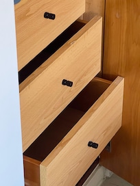 Der Kleiderschrank, die Tür lässt sich nur leicht öffnen. Die vorhandenen Schubladen lassen sich nicht benutzen, weil der Nachttisch die Türöffnung versperrt.
