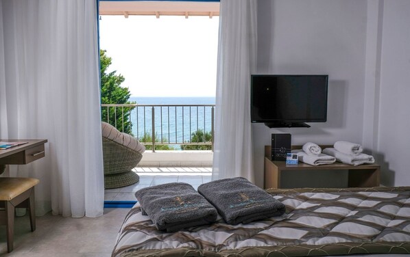 The property features a private balcony or terrace, offering guests stunning garden and sea views. A safe box is also provided, ensuring guests' valuables are kept secure throughout their stay.