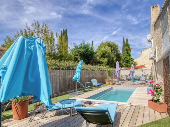 4-Zimmer-Haus 100 m2 auf 2 Stockwerken. Wohn-/Esszimmer mit TV (Flachbildschirm), Klimaanlage. Ausgang zum Garten, zur Terrasse, zum Schwimmbad. 1 Zimmer mit 1 franz. Bett (160 cm, Länge 200 cm), Dusche und Klimaanlage. Ausgang zum Garten. 1 Zimmer mit 1 franz. Bett (140 cm, Länge 190 cm). Offene Küche (4 Kochplatten, Backofen, Geschirrspüler, Wasserkocher, Mikrowelle, Tiefkühler, elektrische Kaffeemaschine, Kapseln für die Kaffeemaschine (Nespresso) extra). Sep. WC. Warmluftheizung. Obergeschoss: (Wendeltreppe) 1 Zimmer mit 1 Bett (90 cm, Länge 190 cm), sep. WC und Dusche. Südlage und Ostlage. Terrassenmöbel, Elektrogrill. Zur Verfügung: Waschmaschine, Wäschetrockner, Fliegengitter. Internet (WLAN, gratis). Parkplatz (eingezäunt), Breite 240 cm. Bitte beachten: Parkplatz nur für kleine Wagen. Maximal 1 Haustier/Hund erlaubt. Rauchmelder. Inserat einer Privatperson nach Artikel 155, IV, CGI.