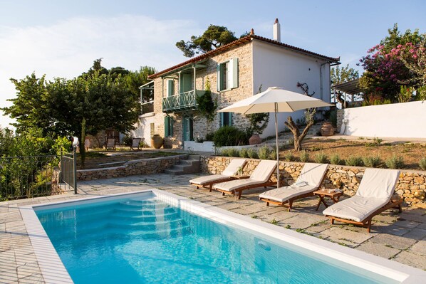 Vorbei an der 10 Meter langen schattigen Veranda, die sich über die gesamte Länge des Gebäudes erstreckt. Und dann der neu errichtete Parterre-Garten und mehr Terrassen und Räume zum Sitzen, Essen, Sonnenbaden oder Beobachten des Abschieds der Boote. Von hier aus haben Sie einen herrlichen Blick über die Ägäis auf die Nachbarinseln Alonissos und die unbewohnten Satelliten Ayia Panagia und Gioura (berühmt für seine wilden Ziegen).
