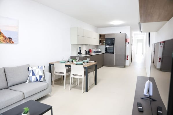 It features 2 cosy bedrooms, a chic living room with TV, a dining area and a fully equipped kitchen.