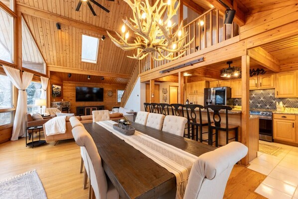 STUNNING ski chalet with breathtaking mountain views, extra large kitchen, hot tub and only a 4 minute drive (or free shuttle ride) to the slopes. Wake up to the most picturesque scenery, catch the shuttle to the slopes, then wind down with a glass of wine by the fire or relax in the hot tub as you watch the sunset. Finish the night off in the NEWLY renovated basement which includes several activities, a wet bar, & the most comfortable couch in front of the home`s 2nd fireplace!
