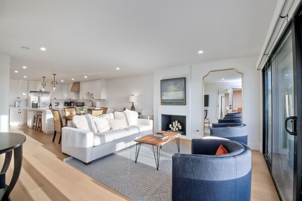 - Sunny living room with ocean views and a sliding door leading to a balcony with views of the coastline
