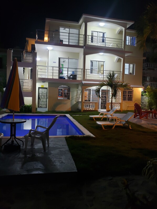The Fiesta (#3) 1 Bed 1 Bath third level front (sleeps 2-4) with balcony overlooking pool and garden. Gorgeous, newly renovated fully equipped central Sosua, a ten-minute taxi ride ($25) from Puerto Plata Airport. Adults-only. Quiet area, only a 5-minute walk to beautiful Playa Alicia and a seven-minute walk to Playa Sosua. Easy walk to restaurants, bars, nightlife, market, shopping, supermarkets, casino, and gym. Free Internet and cable TV. Gated with pool.