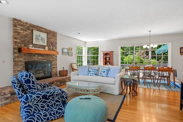 Guests love the open living and dining room with hardwood floors. Comfy furniture lends itself to conversation and group bonding time. The natural gas fireplace can be used in the off season. The flat screen TV is perfect for family movie night. The dining area has a long table with 6 chairs with slider access to the back deck and private yard. The sliding doors would be perfect to keep open and let in the cool breezes on a not-so-hot day - however, the home does provide central A/C to keep you cool on hot, summer days.