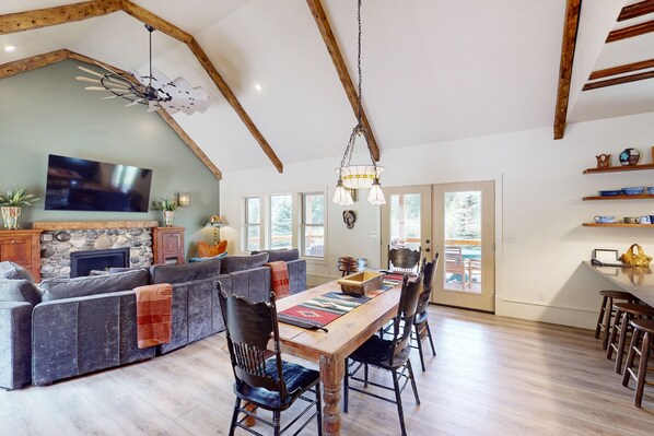 Modernly updated with vaulted ceilings, comfortable furnishings, and an open layout - the interior of your stay features welcoming green accents, bohemian patterns, and wood finishes. The chef of your group will adore the kitchen's farmhouse sink, stainless steel appliances, and beautiful dishware. The adjacent living room creates a cozy space for everyone to sit around the heat of the gas fireplace and catch up on the day's happenings.