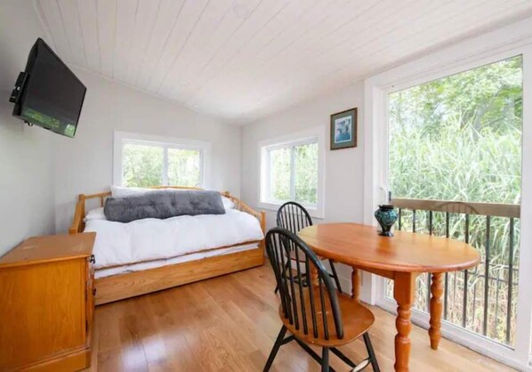 Open space, all new renovations and paint/floor/amenities. Bedrooms both have FULL SIZE beds, trundle bed has 2 twins in sun room/ barn door. NOTE: BED LINENS are set aside on bedside table as most groups bring their own (2 Full, 2 twin).