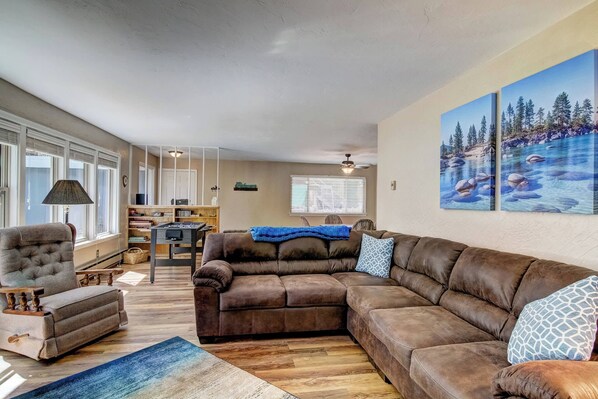 Lovingly maintained by longtime owners, this home blends Tahoe charm with modern updates. Step into a bright, open living area featuring a gas fireplace, large sectional, foosball table, and space to gather after a day on the mountain or lake.