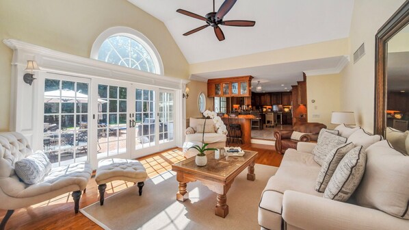 Inside, the homes traditional layout offers a harmonious flow between spaces, blending classic design with modern comfort. The formal living room, complete with a cozy fireplace, sets the tone for relaxed evenings. French doors open directly from the living room to the pool, creating an easy indoor-outdoor connection. Adjacent is the formal dining room, bathed in natural light, perfect for intimate dinners.