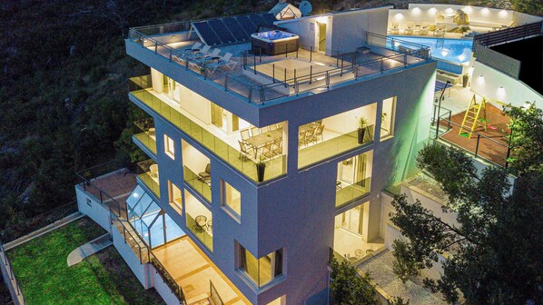 Stellen Sie sich die Villa Father's Dream vor, eine atemberaubende Immobilie, die in den abgeschiedenen Hügeln von Zrnovnica liegt, nur eine kurze 10-Kilometer-Fahrt von der Stadt Split entfernt. Mit ihren ausgedehnten 850 Quadratmetern Fläche bietet diese luxuriöse Villa einen wirklich außergewöhnlichen Rückzugsort für Ihren Aufenthalt.Diese Villa verfügt über 8 geräumige Schlafzimmer, die reichlich Platz für eine Gruppe von Freunden oder eine große Familie bieten. Jedes Schlafzimmer ist geschmackvoll eingerichtet und gewährt Komfort sowie atemberaubende Ausblicke auf die Stadt und das Adria-Meer.