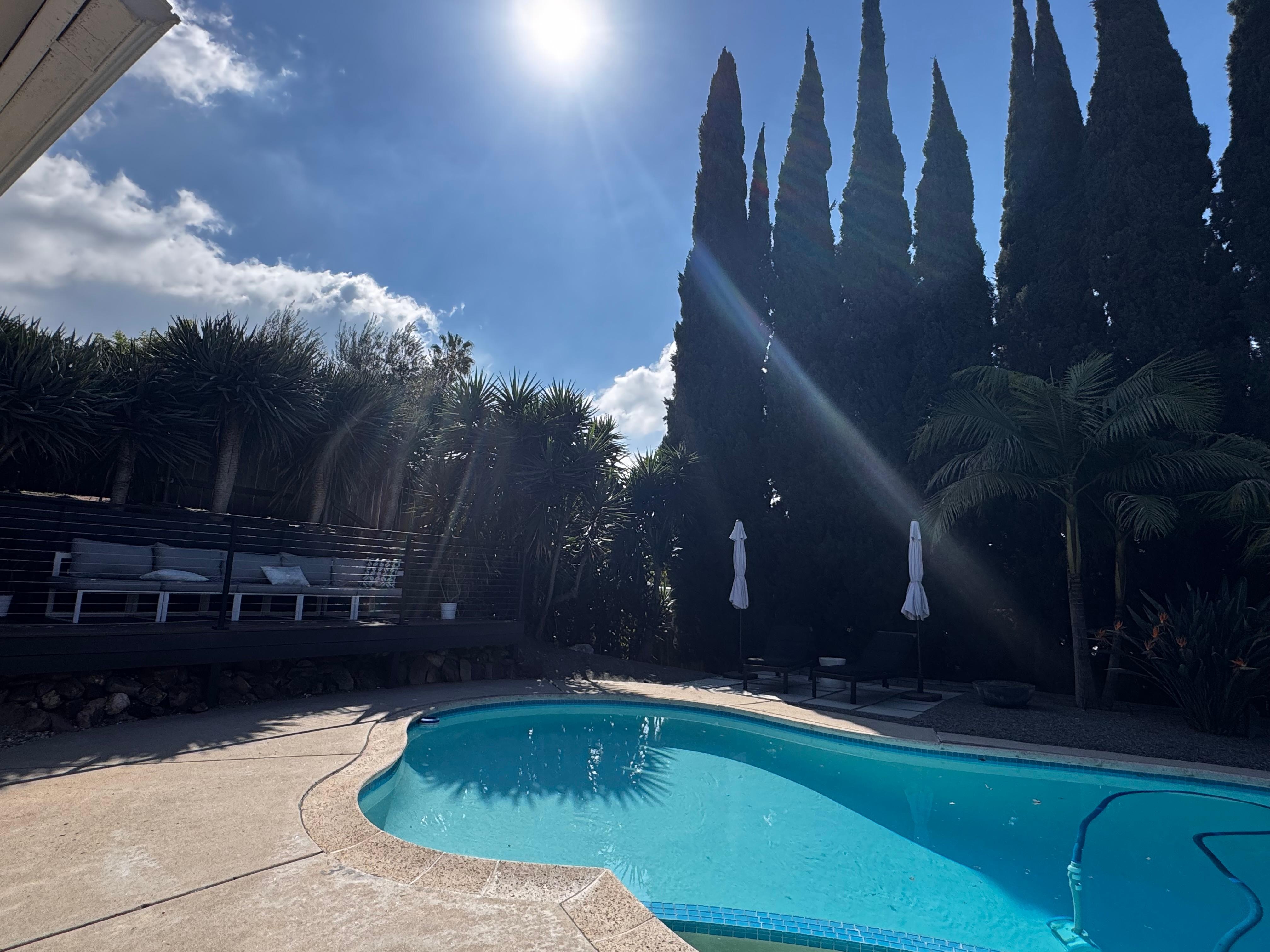 Relax and enjoy all San Diego has to offer from this private MCM oasis in the foothills of Mt Helix. Private pool and hot tub, fruit trees, stylish design and a chef’s kitchen are just a few of the many amenities that await you. Dine al fresco in the beautiful San Diego evenings, watch a movie under the stars on the outdoor screen, roast marshmallows around the fire, splash in the pool or just chill in this high end mid century retreat.