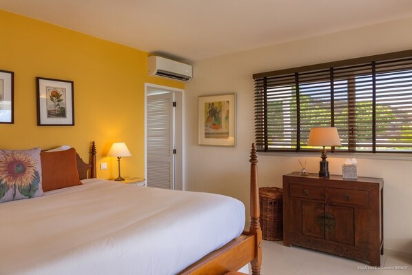 Ideal for a family or group of friends, vacation house Luz has four beautiful, tastefully decorated air-conditioned bedrooms. All have king-size beds and en-suite bathrooms. One bedroom is on the main level and adjoins the living room. Two others are on the lower level and open onto the terrace and the pool. The fourth bedroom is in a separate bungalow located slightly lower for maximum privacy.