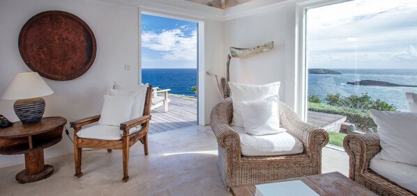 Caramba is a located in Pointe Milou. Overlooking the cliff, it is a luminous and breezy villa. This villa has a breathtaking ocean view from the outside terrace, the living, the opened kitchen and the two bedrooms.