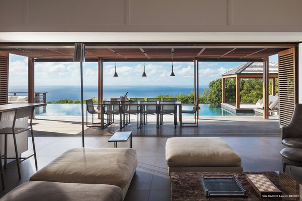 This 2 Bedroom Villa can be rented as a 1, 3, 4, or 5 Bedroom Villa at special rates! Caro is situated in Gouverneur and offers a grandiose vista from its large terrace. You will see never ending water while standing in its spacious overflowing pool. The large gazebo covers a welcoming outside living room. Very modern, Caro’s living room doors are hidden by optical illusions that unveil sophisticated bedrooms with large dressings. Two outside bungalows are composed each of a bedroom and a bathroom.