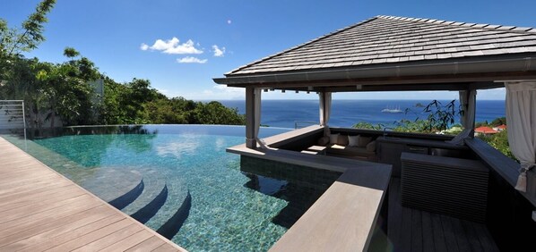 Outside, onto the terrace, guests will fully comprehend the majesty that is the island of St. Barts. The view from Villa Fleur de Cactus is incomparable, equal parts dream like and very much real. Standing watching ships on the horizon will render anyone completely at peace, engulfed in the overwhelming serenity of the Caribbean Sea. The pool deck is also equipped with a shaded outdoor gazebo, complete with bar and fridge, in which to enjoy a moment out of the sun. Further, at night the stars alight and dance overhead creating a fairy-tale atmosphere for any lucky enough to enjoy it. A trip to St. Barts is not complete without an evening spent stargazing, wrapped in the arms of someone special.