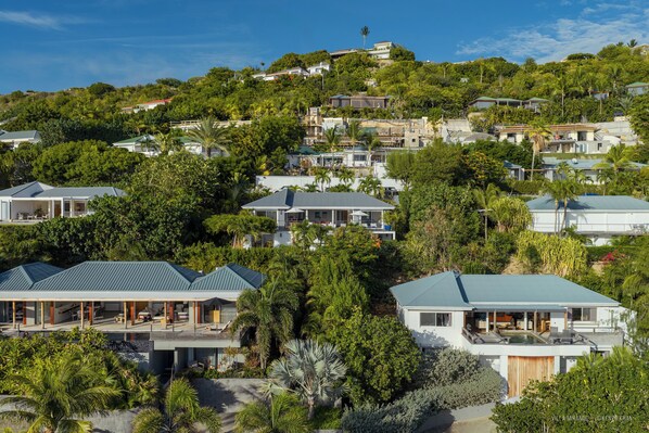 Mirande is situated on the hillside of Pointe Milou. On the west side, facing the sunset, it gets a maximum of sunlight.