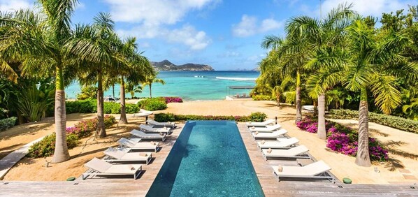Palm Beach is situated in Lorient within walking distance to the beach. The long heated infinity pool is surrounded by a large deck and then by sand, we could believe the villa is on the beach.