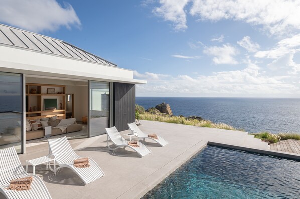 This 3 Bedroom Villa can be rented as a 1, 2 or 4 Bedroom Villa at special rates! The villa has four bedrooms, each with its own bathroom. One has an additional bathtub, while two others also offer outdoor showers. The living room is spacious and elegant, offering a comfortable space for relaxing and entertaining. The professional-style kitchen opens onto an outdoor terrace overlooking the garden, which includes a barbecue and pizza oven, perfect for al fresco dining with friends. Another outdoor terrace on the ocean side features a large heated swimming pool overlooking the ocean and offering exceptional views from the top of the cliffs. The villa features a modern, upscale design, with quality furnishings. The garden is beautifully landscaped, adding a touch of greenery and serenity to the whole property. Villa Paulista is the ideal place for those seeking a luxurious vacation in a private and spectacular setting.
