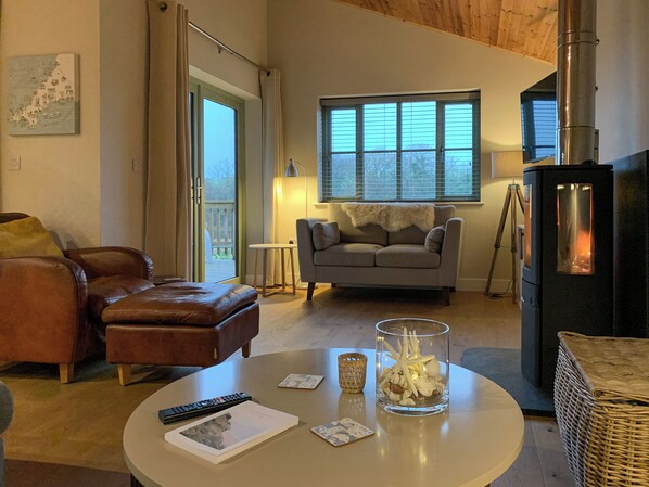 Wohnbereich: Mit Holzofen, 49 "Smart TV und DAB-Radio.