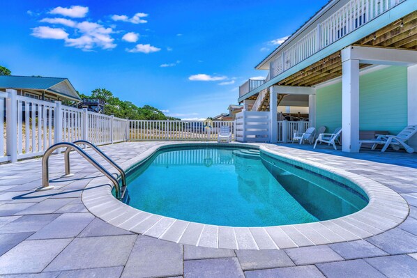 Enjoy the private outdoor pool which key locks from both entrances to ensure the safety of children (pool can be HEATED for an additional $350 per stay except the months of December, January & February), park-style charcoal grill, and an outdoor shower. Golf carts, which can be rented, can be driven directly from the home. They are not allowed on Gulf Beach Drive, however, the side street is one house down in which you would access the golf-cart friendly roads.