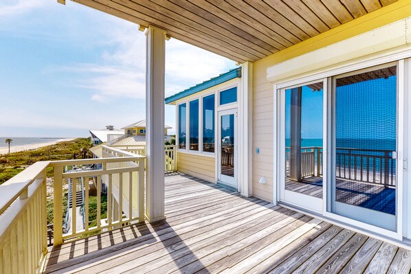 The second floor features the open-concept living area with a bonus sunroom, polished wood ceilings, and hardwood floors. Gorgeous views can be seen from every angle. The remodeled kitchen features high-end stainless appliances including a six-burner gas stove. The breakfast bar seats four for coffee and conversation. The beachfront dining area seats eight for Gulf views over dinner. The spacious living room offers plenty of room for conversation, watching TV, and playing cards and board games. Just off the dining area is a cozy sunroom that makes for a great place to get a quiet moment away with your morning coffee.