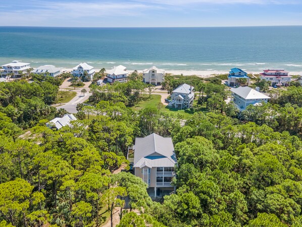 - Spacious, screened deck with outdoor seating and views of the Gulf.