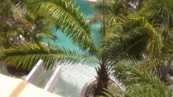Die vielen Fenster der Wohnung befinden sich direkt über dem glitzernden Pool im Lagunenstil mit herrlichen Fuchsschwanz- und afrikanischen Ölpalmen, die sich bis zur Veranda erheben, und halten die Gäste mit der lebendigen und dennoch ruhigen Umgebung in Verbindung und am Leben. Die Sehenswürdigkeiten, Geräusche und Gefühle von fließendem Wasser umgeben die Wohnung - mit dem Pool auf dem Dach, dem Pool darunter und dem nahe gelegenen Strand in der Nachbarschaft im Blick. Je mehr Sie in den Pools und der Bucht von innen und rund um die Wohnung nehmen, desto besser. Die Allgegenwart von Wasser bietet solch dramatische Sehenswürdigkeiten auf dem Grundstück. Das Wasser reflektiert auch wunderschön den Himmel, die Hänge und die tropische Vegetation.