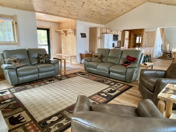 The main level of Lakeside Pines features a brand-new addition, nearly doubling the common space. Here you will find a large great room living area, a dining room with seating for 11, a fully appointed kitchen, one bedroom with a queen bed, a full bathroom, and a laundry room. The great living room serves as the perfect place to relax while enjoying the beautiful lake views. A 65” smart TV above a beautiful gas fireplace keeps everyone warm and busy on rainy days,