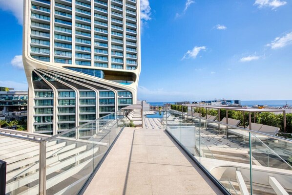 As a guest, you have FREE access to the exclusive rooftop pool area, complete with sun loungers and breathtaking views.
