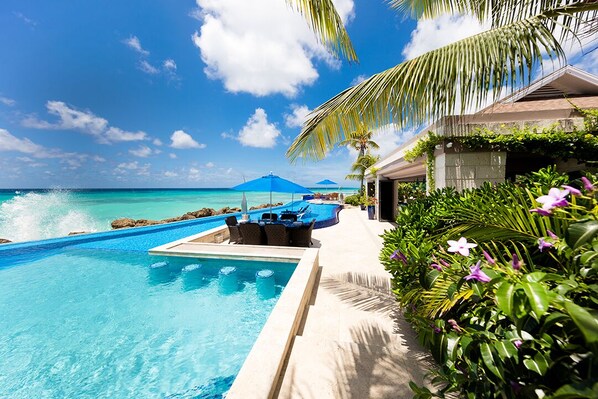 An infinity pool with the ocean as the backdrop, a spacious deck area and an open-plan dining/living area with a chic indoor glass bar between them set the stage for surroundings that are invigorating and breathtaking.