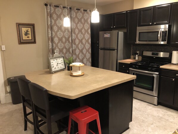 Komplette Annehmlichkeiten werden in der Küche angeboten, darunter ein Keurig mit Kaffee, persönlicher Google-Assistent. Klappbare Gartenmöbel stehen im Haus zur Verfügung, damit Sie draußen die Terrasse genießen können.